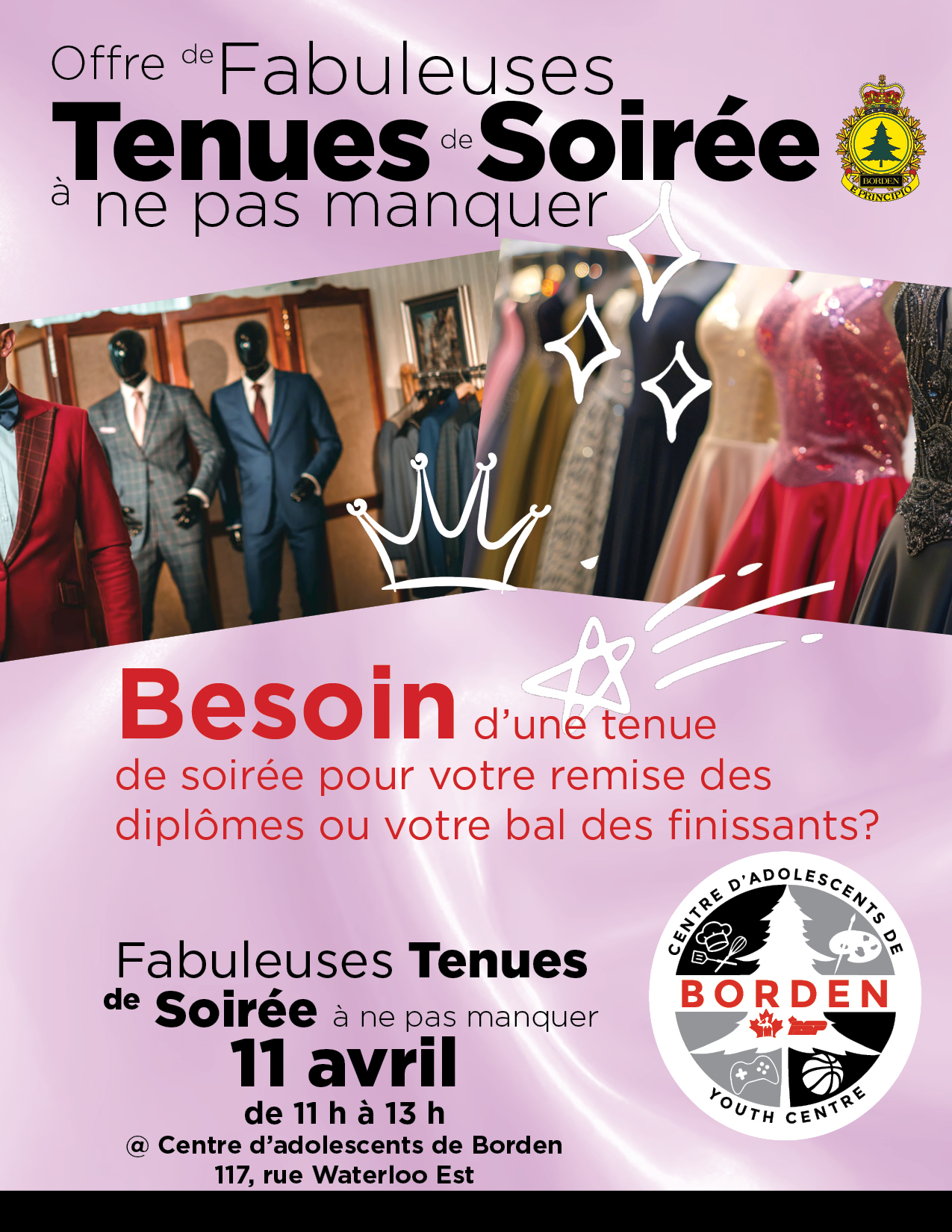 Jetez un coup d’œil à l’offre de fabuleuses tenues de soirée à ne pas manquer! Rendez-vous au Centre d’adolescents de Borden le 11 avril de 11 h à 13 h.