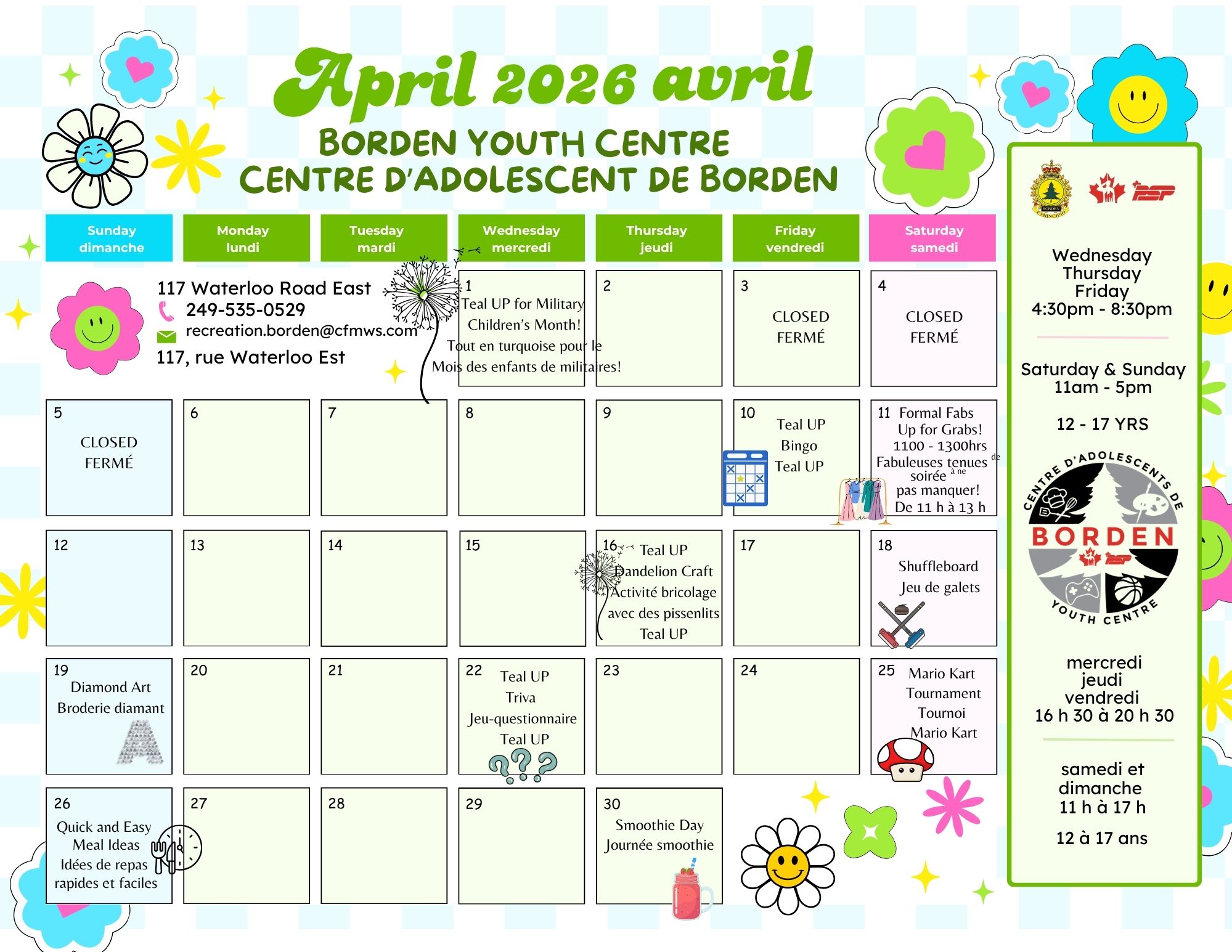 Notre Centre d’adolescents de Borden contient une aire de détente, des télévisions à écran géant, des consoles de jeux vidéo, des RV (réalité virtuelle), des jeux de société, de la machine à Cricut, du matériel d’art et d’artisanat et plus encore!