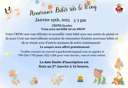 Votre CRFM veut vous féliciter et accueillir votre bébé avec une soirée de plaisir et de jeux ! C'est une merveilleuse occasion de rencontrer d'autres nouveaux bébés et de se réunir avec d'autres mamans de votre communauté.