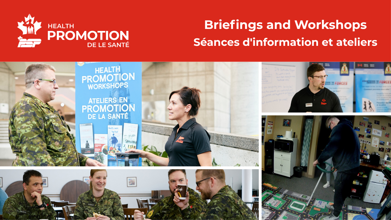 Que vous souhaitiez obtenir des informations sur la nutrition, la réduction des blessures, la gestion du stress et plus encore, l'équipe de promotion de la santé de la 15e Escadre dispose d'une liste complète de séances d'information et de cours. Les ateliers et les séances d'information sont gratuits pour tous les membres des Forces armées canadiennes, leurs conjoints, les membres de l'Équipe de défense élargie et les entrepreneurs. Nous proposons également des cours éligibles au code MITE.