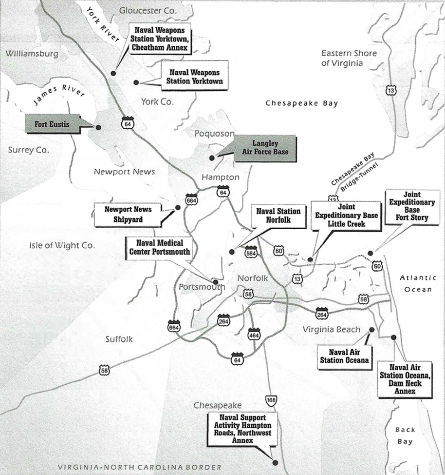 Les MTF comprennent le Naval Medical Centre Portsmouth (NMCP) et les 7 Branch Health Clinics suivants, ainsi que 3 TRICARE Prime Clinics répartis dans la région de Hampton Roads :