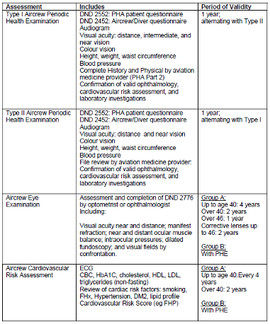 Personnel navigant : Les membres du personnel navigant actif (ceux qui occupent des postes de pilotage ou de contrôle) connaissent généralement les délais pour les examens médicaux de type 1 ou de type 2, dont les détails sont décrits dans la directive AMA 100-01 Medical Standards for CAF Aircrew (normes médicales pour les membres du personnel navigant des FAC). Toutefois, les équipages affectés aux États-Unis pour une durée supérieure à deux ans à des postes autres que de vol ou de contrôle peuvent renoncer aux examens médicaux du personnel navigant et passer à une ASP pour le personnel non navigant (voir ci-dessus). Tous les membres d'équipage devaient passer un examen médical de type 1 valide avant de quitter le Canada.