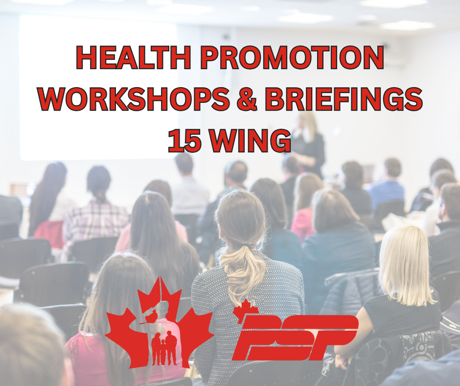 Que vous souhaitiez obtenir des informations sur la nutrition, la réduction des blessures, la gestion du stress et plus encore, l'équipe de promotion de la santé de la 15e Escadre dispose d'une liste complète de séances d'information et de cours. Les ateliers et les séances d'information sont gratuits pour tous les membres des Forces armées canadiennes, leurs conjoints, les membres de l'Équipe de défense élargie et les entrepreneurs. Nous proposons également des cours éligibles au code MITE.