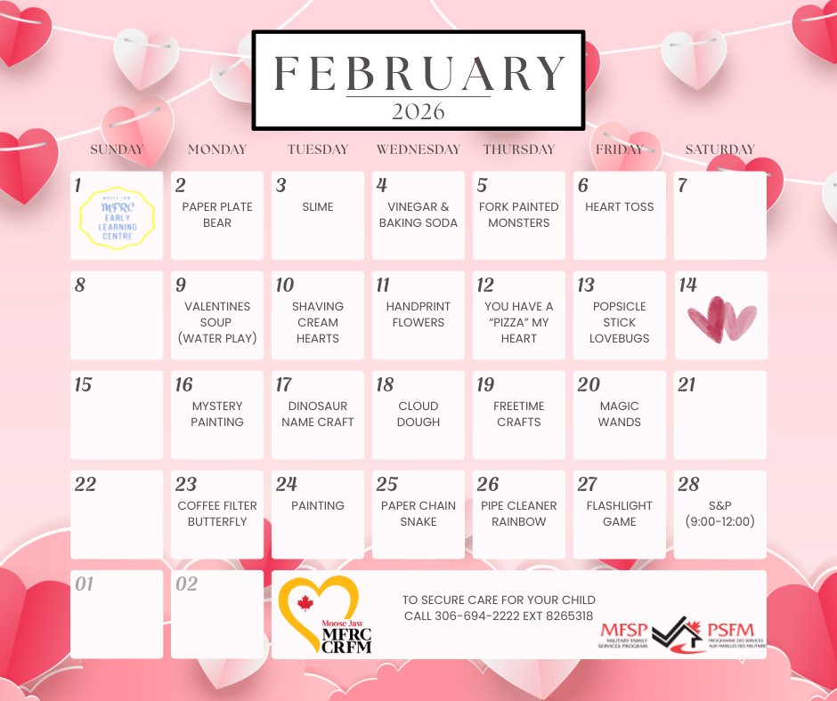 Les Services aux familles militaires (SFM) de Moose Jaw offrent des services de garde occasionnelle par l'entremise du Centre d'apprentissage pour les jeunes enfants "ELC".