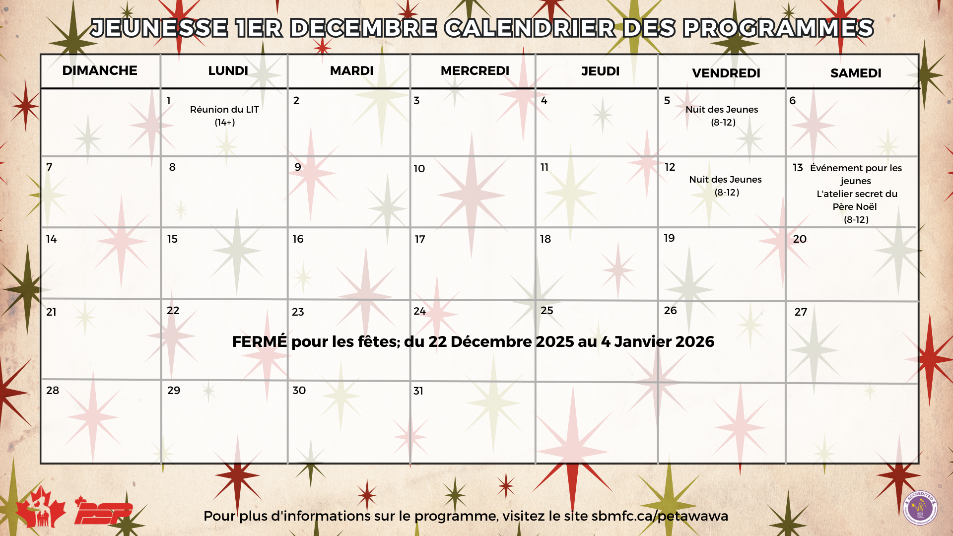 Le Youth 1st Centre sera FERMÉ du 22 décembre 2025 au 4 janvier 2026. Nous souhaitons à tous nos membres et à leurs familles de joyeuses fêtes.Le Centre de jeunes Youth 1st est un lieu sécuritaire et sans discrimination qui accueille les jeunes de la communauté pour qu’ils puissent profiter des programmes que nous offrons sur la vie saine et active. Notre objectif est de susciter la participation des jeunes en mettant en place des programmes et des services interactifs durables. La programmation du Centre de jeunes est conçue de manière à établir un équilibre entre les plages horaires dédiées aux activités libres et celles consacrées aux excursions et aux événements spéciaux mensuels. Nous offrons des activités de soutien inclusives, stimulantes, axées sur l’acquisition de compétences et facilement accessibles.