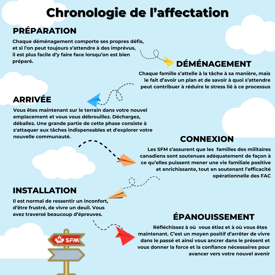 De nombreuses familles de militaires connaissent des changements et des difficultés à différents moments de l'année, en fonction de leur position dans le cycle des affectations. Reconnaître que chaque famille est unique et que la gamme des émotions qui peuvent être associées aux défis du mode de vie militaire peut varier pour chaque membre de la famille.Reconnaître que même si la société se prépare à une nouvelle année, les familles de militaires peuvent arriver à la fin d'une affectation ou d'une réinstallation, ou se préparer à une nouvelle affectation ou réinstallation.Certaines familles vivent une nouvelle " expérience " à différents moments de l'année, ce qui peut susciter des sentiments d'excitation, d'incertitude, de peur et de déception.